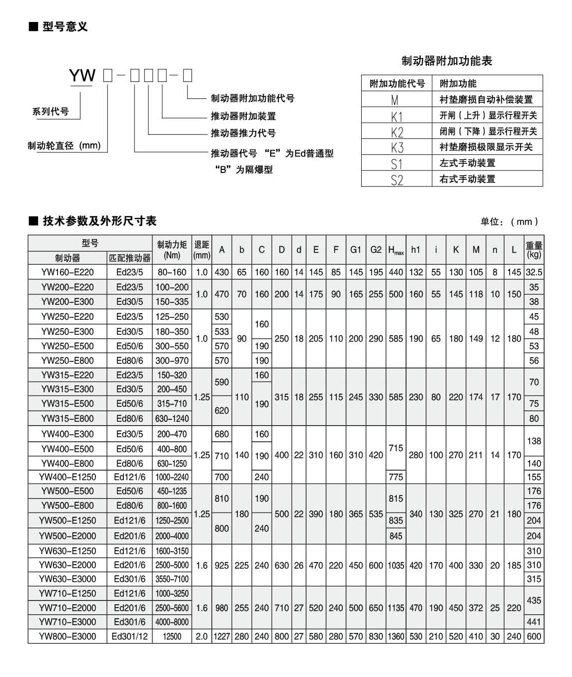 應用:YW,YWZ13系列電力液壓鼓式制動器,廣泛應用于有防爆要求的各種起重運輸、皮帶運輸、港口裝卸、冶金及建筑機械中各種機構(gòu)的減速和停車(維持)制動。符合標準:YW,YWZ13系列電力液壓鼓式制動器的連接尺寸和技術(shù)要求符合JB / T6406-2006標準;制動力矩參數(shù)符合DIN15435標準,配套符合DIN15430標準的Ed系列推動器。主要特點:▲ 聯(lián)鎖式退距均等裝置和瓦塊自動隨位裝置,可始終保持兩側(cè)瓦塊退距均等且無需調(diào)整,完全避免因退距不均使一側(cè)制動襯墊浮貼制動輪的現(xiàn)象;▲ 主要擺動鉸點均設(shè)有自潤滑軸承,傳動效率高,壽命長,使用中無需潤滑;▲ 制動彈簧在方管內(nèi)布置并設(shè)有標尺,用戶可十分方便地讀出制動力矩值,免去測量和計算的麻煩;▲ 制動襯墊為卡裝式整體成型結(jié)構(gòu),更換十分方便、快捷,備有半金屬(無石棉)硬質(zhì)和半硬質(zhì),軟質(zhì)(無石棉)等不同材質(zhì)的制動襯墊供用戶選擇;▲ 配套Ed系列電力液壓推動器產(chǎn)品,動作靈敏、使用壽命長;▲ 常閉式設(shè)計,(斷電)彈簧制動,(通電)推動器釋放。工作條件:◆ 海拔高度:<2000m;◆ 環(huán)境溫度:-20°C?+ 40°C;◆ 相對濕度:≤90%;◆ 工作制:間歇性(S3-60%)和連續(xù)(S1);◆ 電源電壓:三相交流,AC380 50Hz (其他電源等級可按需要定制);◆ 有特殊要求時在訂貨時協(xié)商確定。基本參數(shù):● 產(chǎn)品型號:YW-160、YW-200、YW-250、YW-315、YW-400、YW-500、YW-630、YW-710、YW-800● 適用輪徑:160~800mm● 制動力矩:80~12500Nm● 產(chǎn)品型號:YWZ13-200、YWZ13-250、YWZ13-315、YWZ13-400、YWZ13-500、YWZ13-630、YWZ13-710、YWZ13-800● 適用輪徑:200~800mm● 制動力矩:80~12500Nm