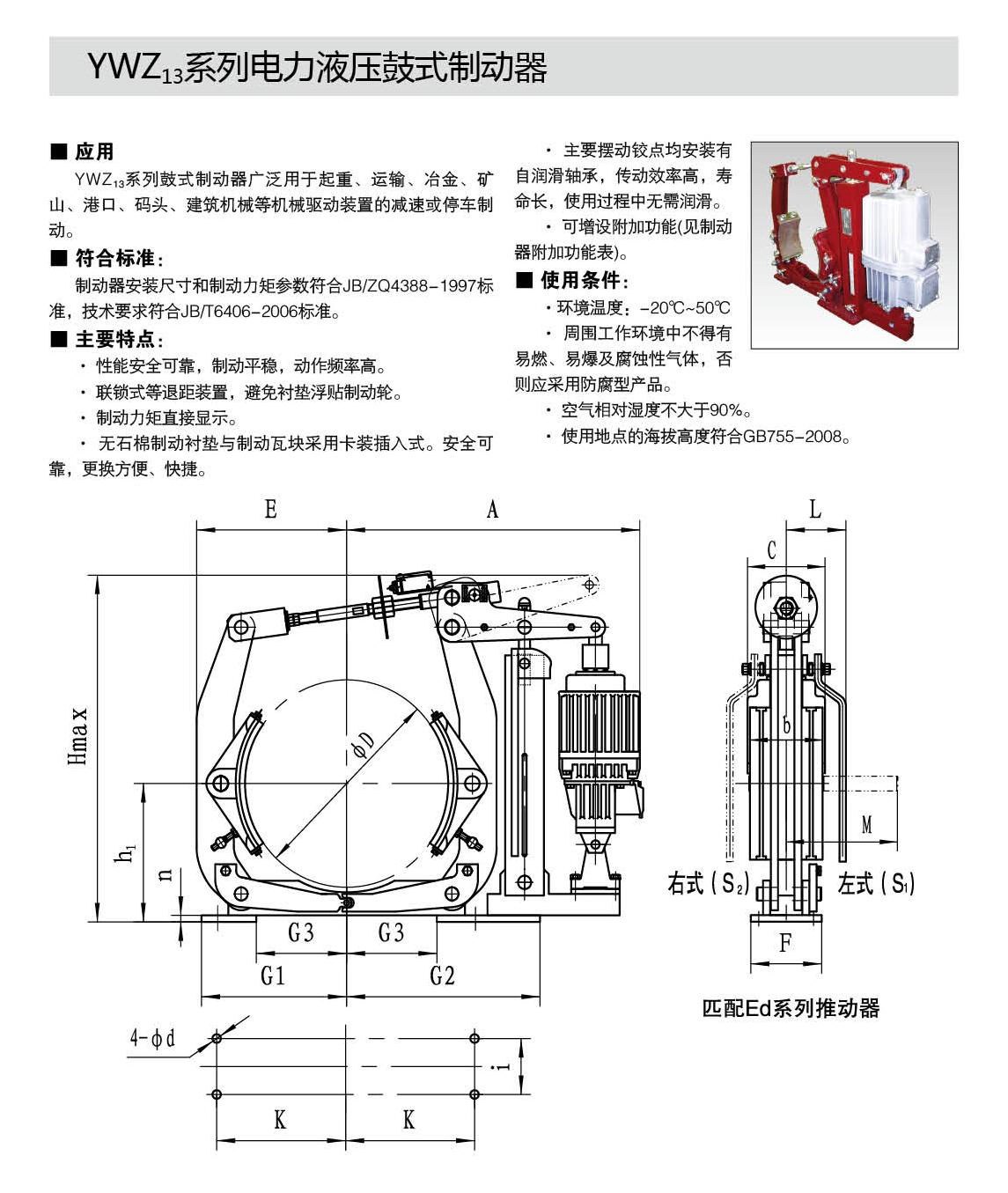 YW,YWZ13系列電力液壓鼓式制動器的連接尺寸和技術(shù)要求符合JB / T6406-2006標準;制動力矩參數(shù)符合DIN15435標準,配套符合DIN15430標準的Ed系列推動器。