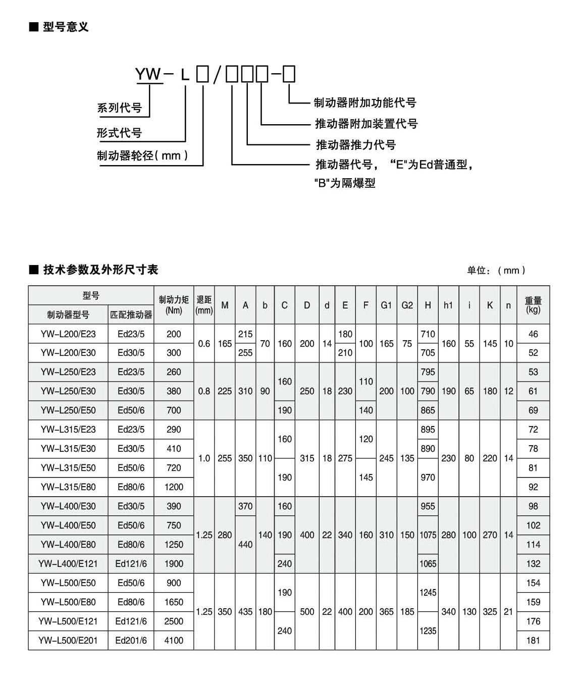 應(yīng)用:YW,YWZ13系列電力液壓鼓式制動器,廣泛應(yīng)用于有防爆要求的各種起重運(yùn)輸、皮帶運(yùn)輸、港口裝卸、冶金及建筑機(jī)械中各種機(jī)構(gòu)的減速和停車(維持)制動。符合標(biāo)準(zhǔn):YW-L系列制動器連接尺寸及制動力矩參數(shù)符合JB/T6406-2006標(biāo)準(zhǔn)和DIN15435標(biāo)準(zhǔn)。配套符合DIN15430標(biāo)準(zhǔn)的Ed系列推動器。主要特點(diǎn):▲ 聯(lián)鎖式退距均等裝置和瓦塊自動隨位裝置,可始終保持兩側(cè)瓦塊退距均等且無需調(diào)整,完全避免因退距不均使一側(cè)制動襯墊浮貼制動輪的現(xiàn)象;▲ 主要擺動鉸點(diǎn)均設(shè)有自潤滑軸承,傳動效率高,壽命長,使用中無需潤滑;▲ 制動彈簧在方管內(nèi)布置并設(shè)有標(biāo)尺,用戶可十分方便地讀出制動力矩值,免去測量和計(jì)算的麻煩;▲ 制動襯墊為卡裝式整體成型結(jié)構(gòu),更換十分方便、快捷,備有半金屬(無石棉)硬質(zhì)和半硬質(zhì),軟質(zhì)(無石棉)等不同材質(zhì)的制動襯墊供用戶選擇;▲ 配套Ed系列電力液壓推動器產(chǎn)品,動作靈敏、使用壽命長;▲ 常閉式設(shè)計(jì),(斷電)彈簧制動,(通電)推動器釋放。工作條件:◆ 海拔高度:<2000m;◆ 環(huán)境溫度:-20°C?+ 40°C;◆ 相對濕度:≤90%;◆ 工作制:間歇性(S3-60%)和連續(xù)(S1);◆ 電源電壓:三相交流,AC380 50Hz (其他電源等級可按需要定制);◆ 有特殊要求時(shí)在訂貨時(shí)協(xié)商確定?;緟?shù):● 產(chǎn)品型號:YW-L200、YW-L250、YW-L315、YW-L400、YW-L500● 適用輪徑:200~500mm● 制動力矩:200~4100Nm