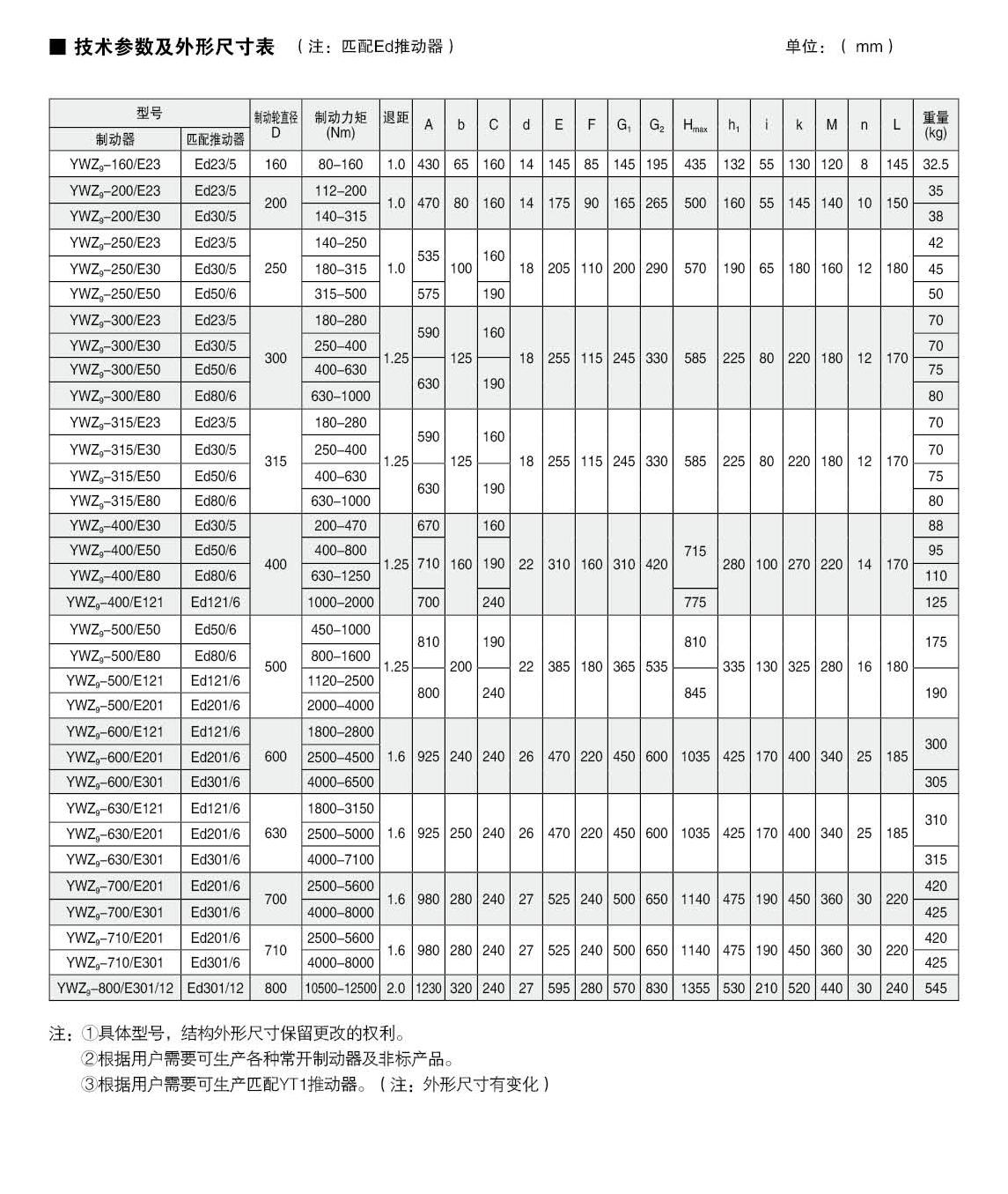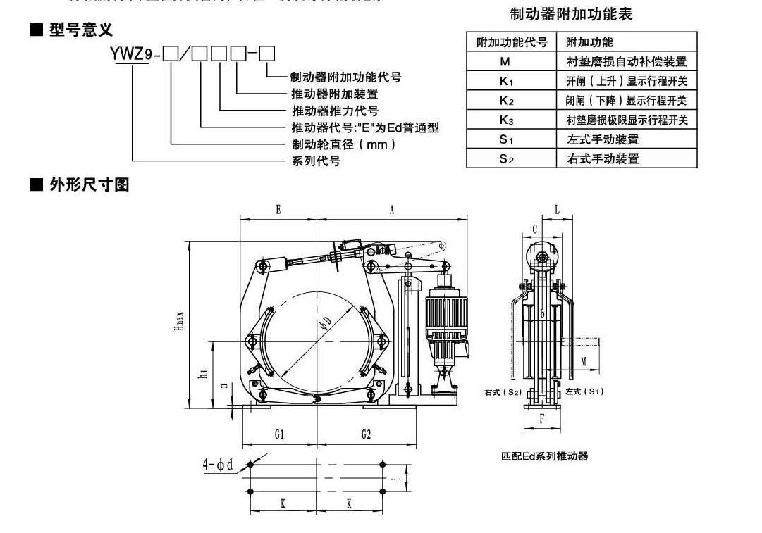 應(yīng)用:YWZ5  YWZ9系列電力液壓鼓式制動器,廣泛應(yīng)用于有防爆要求的各種起重運輸、皮帶運輸、港口裝卸、冶金及建筑機械中各種機構(gòu)的減速和停車(維持)制動。符合標準:YWZ5系列電力液壓鼓式制動器的連接尺寸和制動力矩參數(shù)符合GB6333-86標準,技術(shù)要求符合JB / T6406-2006標準,配套符合DIN15430標準的Ed系列推動器。主要特點:▲ 聯(lián)鎖式退距均等裝置和瓦塊自動隨位裝置,可始終保持兩側(cè)瓦塊退距均等且無需調(diào)整,完全避免因退距不均使一側(cè)制動襯墊浮貼制動輪的現(xiàn)象;▲ 主要擺動鉸點均設(shè)有自潤滑軸承,傳動效率高,壽命長,使用中無需潤滑;▲ 制動彈簧在方管內(nèi)布置并設(shè)有標尺,用戶可十分方便地讀出制動力矩值,免去測量和計算的麻煩;▲ 制動襯墊為卡裝式整體成型結(jié)構(gòu),更換十分方便、快捷,備有半金屬(無石棉)硬質(zhì)和半硬質(zhì),軟質(zhì)(無石棉)等不同材質(zhì)的制動襯墊供用戶選擇;▲ 配套Ed系列電力液壓推動器產(chǎn)品,動作靈敏、使用壽命長;▲ 常閉式設(shè)計,(斷電)彈簧制動,(通電)推動器釋放。工作條件:◆ 海拔高度:<2000m;◆ 環(huán)境溫度:-20°C?+ 40°C;◆ 相對濕度:≤90%;◆ 工作制:間歇性(S3-60%)和連續(xù)(S1);◆ 電源電壓:三相交流,AC380 50Hz (其他電源等級可按需要定制);◆ 有特殊要求時在訂貨時協(xié)商確定?;緟?shù):● 產(chǎn)品型號:YWZ5-160、YWZ5-200、YWZ5-250、YWZ5-315、YWZ5-400、YWZ5-500、YWZ5-630、YWZ5-710、YWZ5-800● 適用輪徑:160~800mm● 制動力矩:80~12500Nm● 產(chǎn)品型號:YWZ9-160、YWZ9-200、YWZ9-250、YWZ9-300、YWZ9-315、YWZ9-400、YWZ9-500、YWZ9-600、YWZ9-630、YWZ9-700、YWZ9-710、YWZ9-800● 適用輪徑:160~800mm● 制動力矩:80~12500Nm